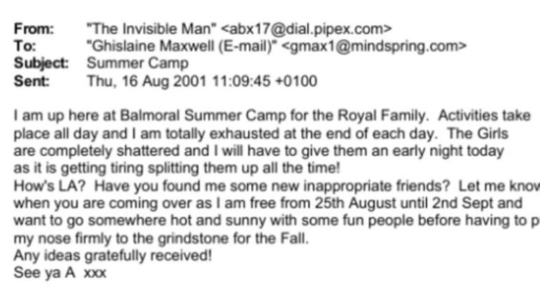 Dosyalarda, “Görünmez Adam” takma adlı bir kişiden Ghislaine Maxwell’e gönderilmiş, 16 Ağustos 2001 tarihli bir e-posta da bulunuyor. E-postada, İngiltere’de Balmoral’daki bir yaz kampında kızların "tamamen dağılmış" olduğuna dair bir ifade yer alıyor. Göndericinin kimliği ve içeriğin bağlamı netleşmezken, belgelerde bu mesajın herhangi bir yanlış eylem çağrısı içermediği not düşülüyor.