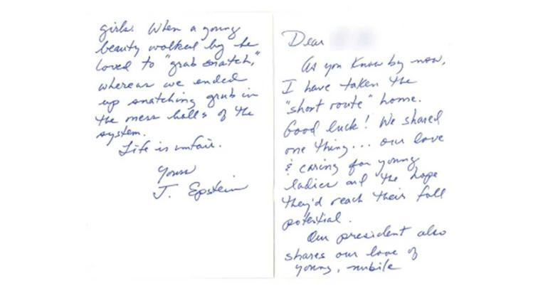 Belgeler arasında Epstein’a atfedilen, alıcısı ve tarihi belirsiz bir kartpostal da yer aldı. Kartta, "Başkanımız da genç ve körpe kızlara olan sevgimizi paylaşıyor" ve "Bir güzellik yürüdüğünde kapmayı severdi"gibi ifadeler bulunuyor. Metinde geçen "başkan"ın kim olduğu netleşmiş değil.