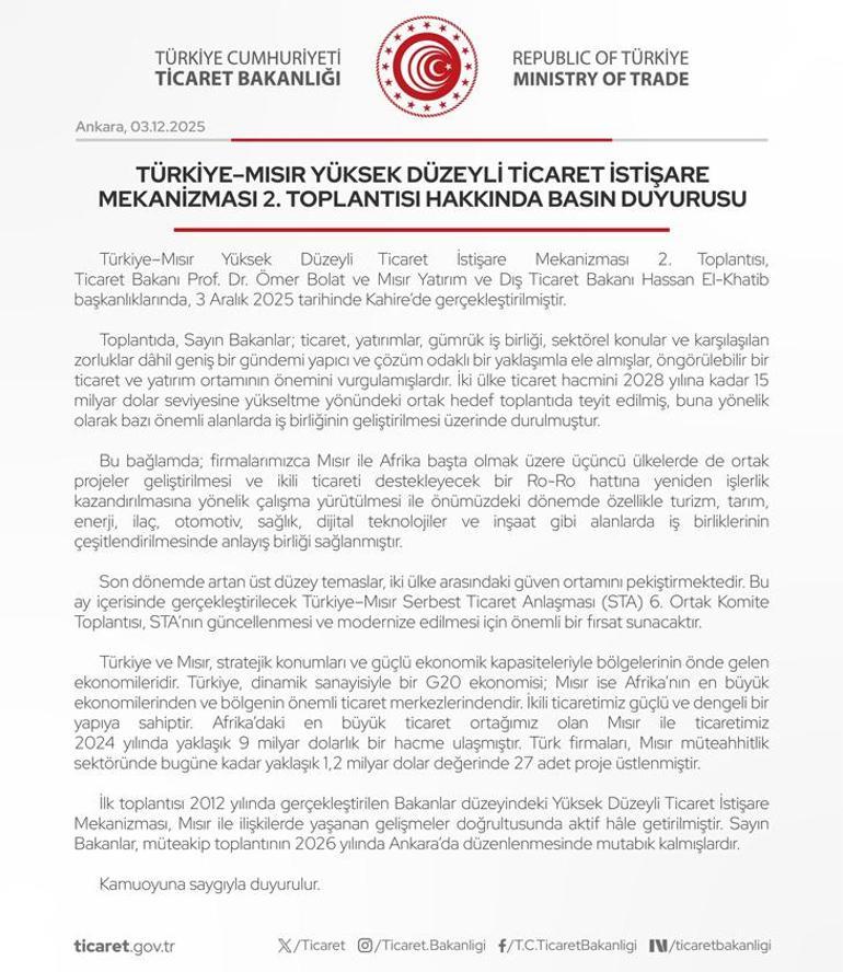 "İkili ticaretimiz güçlü ve dengeli bir yapıya sahiptir. Afrika'daki en büyük ticaret ortağımız olan Mısır ile ticaretimiz 2024'te yaklaşık 9 milyar dolarlık bir hacme ulaşmıştır. Türk firmaları, Mısır müteahhitlik sektöründe bugüne kadar yaklaşık 1,2 milyar dolar değerinde 27 proje üstlenmiştir. İlk toplantısı 2012'de gerçekleştirilen Bakanlar düzeyindeki Yüksek Düzeyli Ticaret İstişare Mekanizması, Mısır ile ilişkilerde yaşanan gelişmeler doğrultusunda aktif hale getirilmiştir. Bakanlar, müteakip toplantının 2026'da Ankara'da düzenlenmesi konusunda mutabık kalmışlardır."